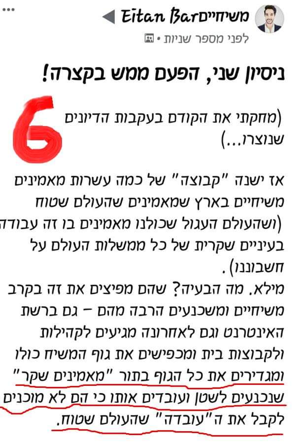 ג) פרסום הגחכות מעליבות בנושא מודל העולם השטוח, במקביל להצגת מצג שווא טוטאלי ומכוון של עלילות שקר בנוגע לאמונתינו בנושא (לדוגמא, שאמרנו שכל מי שלא מאמין במודל העולם השטוח הינו מאמין שקר – דבר שלא אמרנו מעולם) והוספת ההערה הפוגענית לעבר מאמיני מודל העולם השטוח "סכיזופרני משהו".